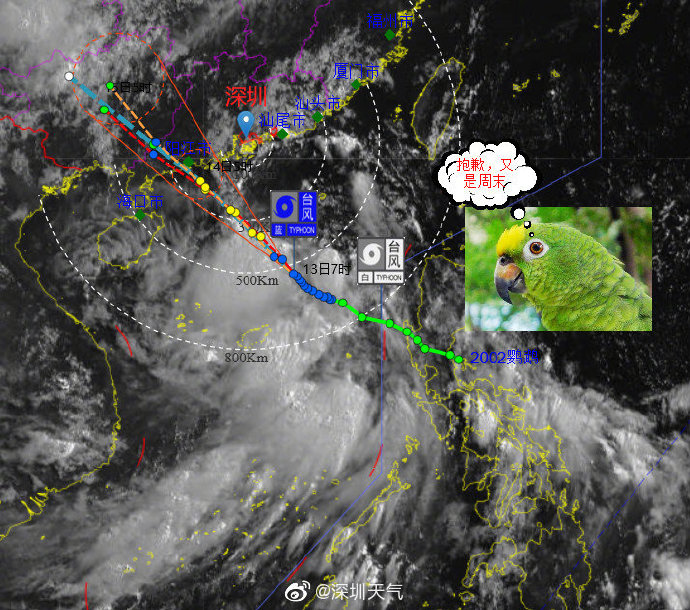 臺(tái)風(fēng)“鸚鵡”預(yù)計(jì)可能于14日08-10時(shí)在陽江附近登陸。受其影響,14日上午深圳市沿海、高地和海區(qū)最大陣風(fēng)8級(jí)左右,午后風(fēng)力減弱;14日早晨到臺(tái)風(fēng)登陸前有間歇性陣雨,臺(tái)風(fēng)登陸后降雨趨于頻密,午后有大雨到暴雨,沿海和高地最大陣風(fēng)8-9級(jí),14日夜間降雨明顯減弱。