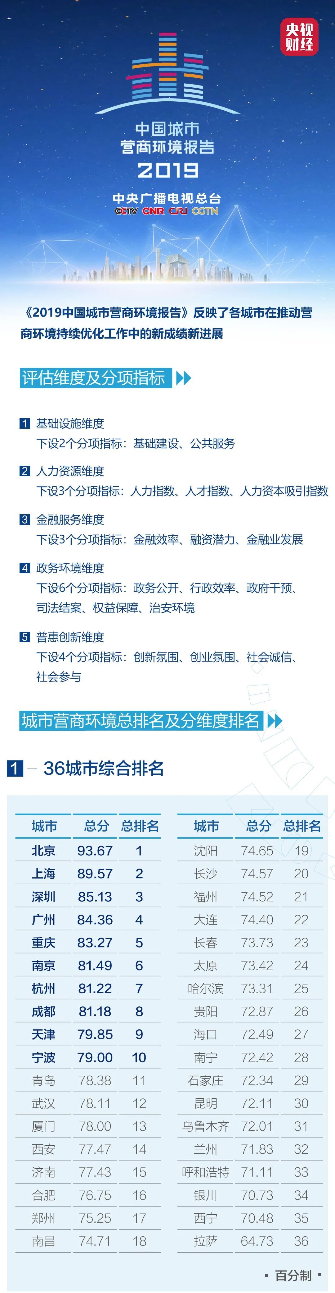 《2019中國(guó)城市營(yíng)商環(huán)境報(bào)告》按照“要素+環(huán)境”的理論框架,設(shè)計(jì)了由五個(gè)維度構(gòu)成的評(píng)價(jià)體系,包括基礎(chǔ)設(shè)施、人力資源、金融服務(wù)、政務(wù)環(huán)境、普惠創(chuàng)新。報(bào)告也同時(shí)發(fā)布了五個(gè)維度的分項(xiàng)排名,覆蓋了制度、市場(chǎng)、資源、技術(shù)、人才、資金等影響企業(yè)經(jīng)營(yíng)發(fā)展的關(guān)鍵環(huán)節(jié),全方位評(píng)價(jià)了各城市營(yíng)商環(huán)境狀態(tài)水平。