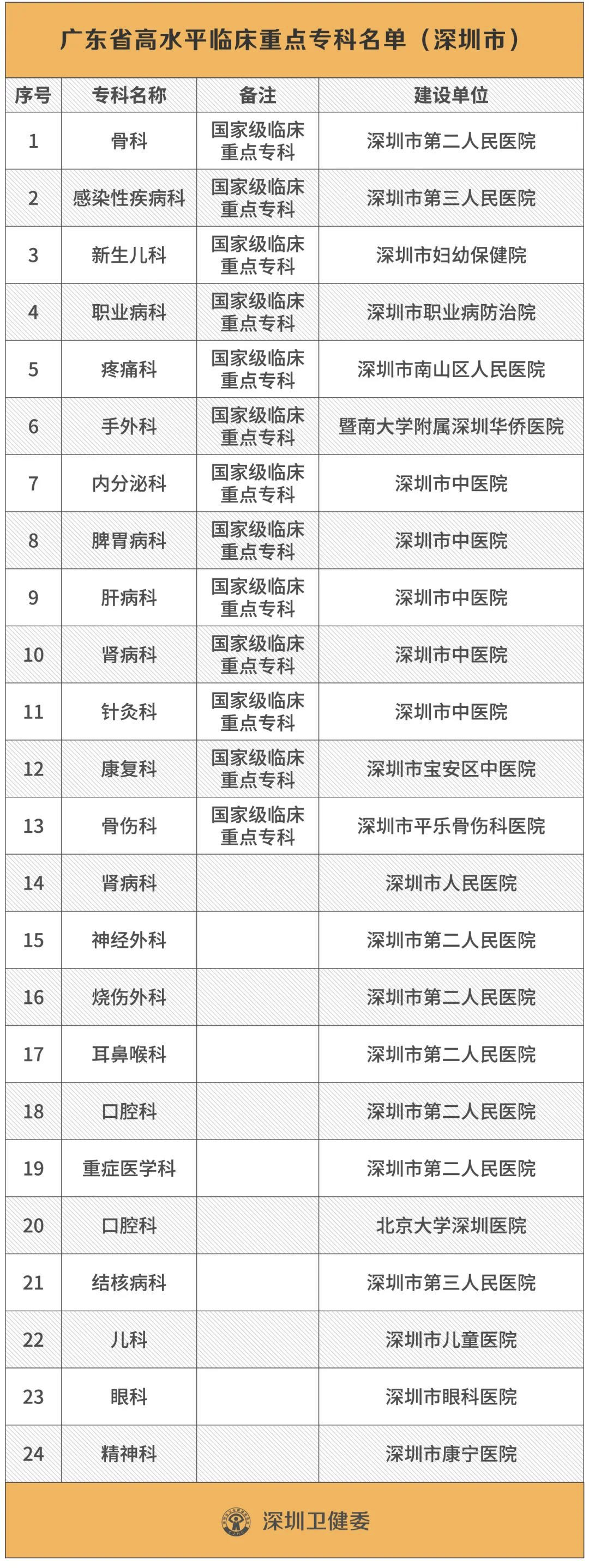 那是因?yàn)樗鼈冊(cè)诹硪环荨笆≈攸c(diǎn)”名單上。這就是2019年由廣東省衛(wèi)健委公布的“廣東省高水平臨床重點(diǎn)專(zhuān)科”名單。深圳一共有24個(gè)專(zhuān)科入選,其中13個(gè)是國(guó)家衛(wèi)健委或國(guó)家中醫(yī)藥管理局認(rèn)定的國(guó)家級(jí)臨床重點(diǎn)專(zhuān)科。