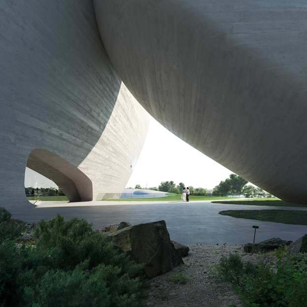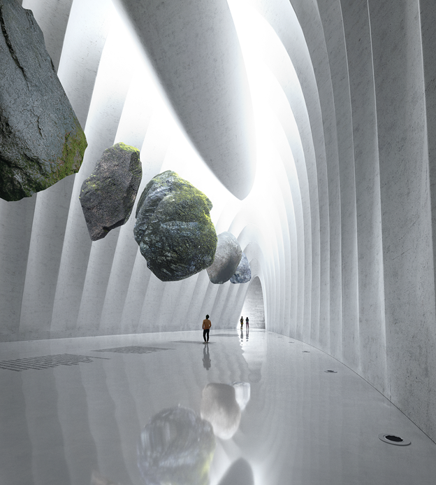 MAD的方案將較大體量的標準展覽空間、公共教育場地、圖書館、接待大堂、咖啡廳、配套商業(yè)等功能放置在首層并覆土,屋頂形成綠地與城市直接連接,構成這個區(qū)域面積最大的公園。順應建筑的曲線,屋頂坡度自然發(fā)展,柔和回落大地,接壤之處設計成數(shù)個下沉庭院,高低相合,延綿不斷。