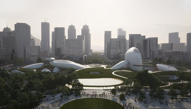 該項目由著名建筑師馬巖松帶領的MAD建筑事務所負責項目方案設計。方案顯示,將以“遠古”和“未來”兩大概念,通過步道串聯(lián)起散落石群建筑、綠地、公共活動區(qū),展現(xiàn)原始氛圍與未來力量的結合。在南館與北館兩個展館中間設有架空中軸景觀連橋,其中超高層的石群展廳將打造出炫目的展覽效果。此外,廣場還將連接深圳人才公園,形成一片連續(xù)的開放空間。
