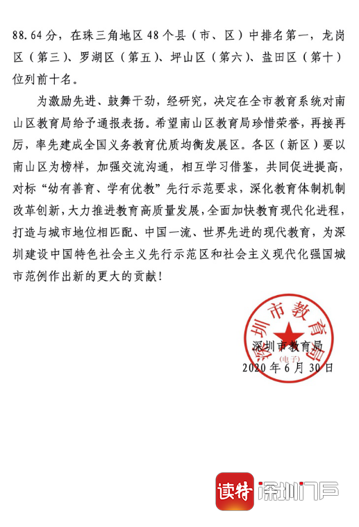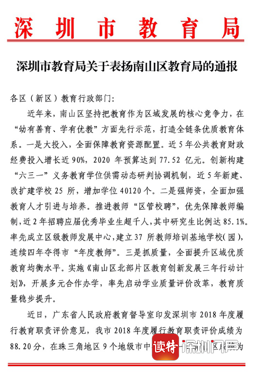 見圳客戶端·深圳新聞網(wǎng)2020年7月1日訊(深圳特區(qū)報(bào)記者 李麗)6月30日,《深圳市教育局關(guān)于表?yè)P(yáng)南山區(qū)教育局的通報(bào)》在全市教育界引起關(guān)注。通報(bào)表示,近日,廣東省人民政府教育督導(dǎo)室印發(fā)深圳市2018年度履行教育職責(zé)評(píng)價(jià)意見,深圳2018年度履行教育職責(zé)評(píng)價(jià)成績(jī)?yōu)?8.20分,在珠三角地區(qū)9個(gè)地級(jí)市中排名第一,其中,南山區(qū)成績(jī)?yōu)?8.64分,在珠三角地區(qū)48個(gè)縣(市、區(qū))中排名第一。經(jīng)研究,決定在全市教育系統(tǒng)對(duì)南山區(qū)教育局給予通報(bào)表?yè)P(yáng),并希望南山區(qū)教育局率先建成全國(guó)義務(wù)教育優(yōu)質(zhì)均衡發(fā)展區(qū)。