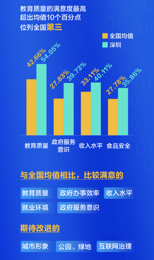 在針對城市治理能力和社會服務的20多項滿意度指標中,深圳有19項高于全國省會城市和直轄市平均水平。其中,市民對教育服務的滿意度最高,超出均值10個百分點,位列全國第三,其次是治安狀況和水、空氣質量,而在政府服務意識和食品安全的滿意度,也排在全國同類第一名。此外,日常生活中的收入和就業(yè),也讓深圳人感覺比較踏實。