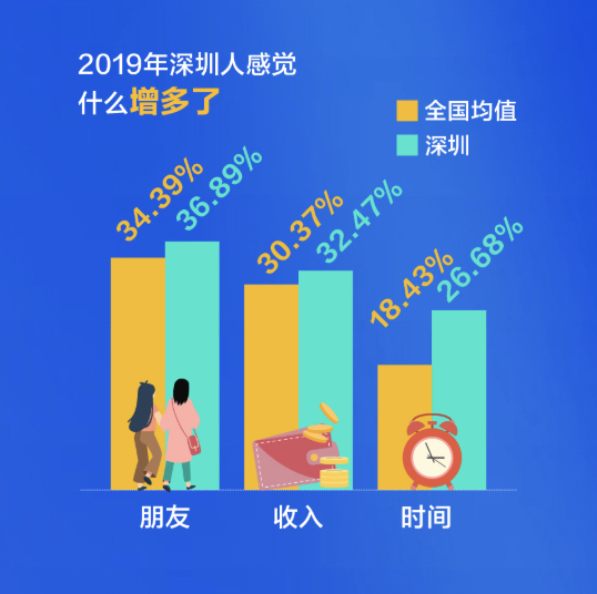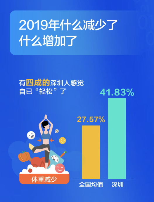深圳人比較關注健康,不管是宅在家還是外出娛樂,他們選擇運動健身的比例都超過全國平均水平,對健康的投資,成就了又一個“苗條之城”。過去這一年,有四成的深圳人感覺自已“輕松”了,體重減少的人群比例高出全國近14個百分點。甩掉了贅肉的同時,深圳人還感覺在時間、朋友、收入這三方面的收獲在增加。尤其是時間,超出了全國均值8個百分點。