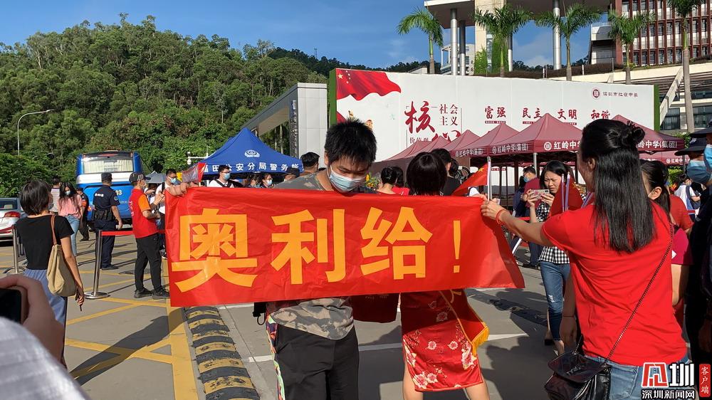 【紅嶺中學】考生學長來到考點門口為學弟舉起“奧利給”的旗子。