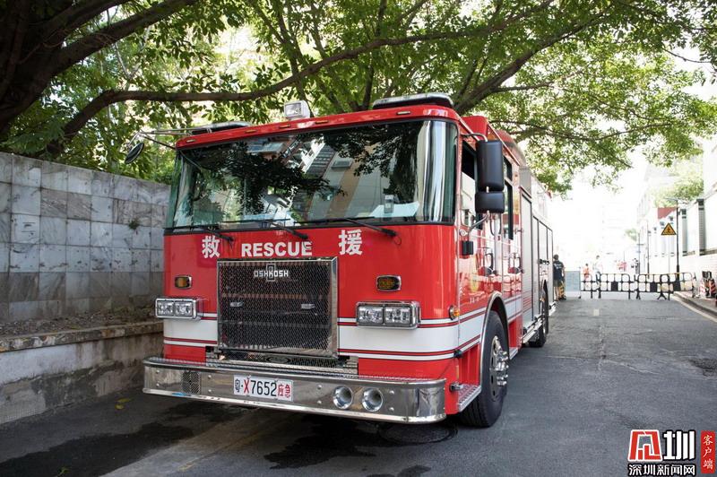 深圳中學考點外待命的消防救援車。