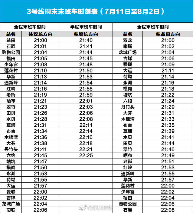 見圳客戶端?深圳新聞網(wǎng)2020年7月8日訊(見圳客戶端、深圳新聞網(wǎng)記者 陳致遠)記者從深圳地鐵了解到,為配合新線開通,7月11日至8月2日的每周六、周日,深圳地鐵3號線將于21時提前結(jié)束運營。其他地鐵線路正常運營。