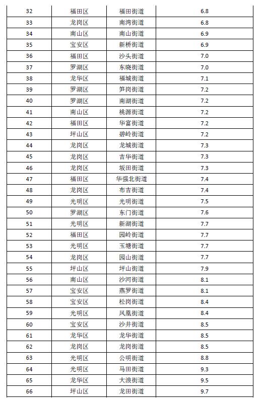 排名前十的街道是:福保街道、福海街道、海山街道、西鄉(xiāng)街道、南園街道、清水河街道、粵海街道、石巖街道、石井街道和蓮花街道;排名倒數后十的是:觀瀾街道、坪地街道、龍?zhí)锝值?、大浪街道、馬田街道、公明街道、龍崗街道、龍華街道、沙井街道和鳳凰街道。