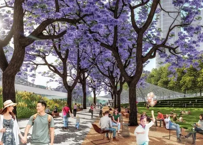 為車(chē)站廣場(chǎng),“水晶山丘”屋面覆蓋著地下車(chē)站樞紐大廳,同時(shí)也在地面創(chuàng)造出造型獨(dú)特的城市地標(biāo)。光影和夜景效果與交叉的藍(lán)花楹大道配合,打造一個(gè)極具設(shè)計(jì)感的交通集散空間。地下共享大廳、地下森林與地面廣場(chǎng)、周邊建筑建立視覺(jué)聯(lián)系,成為中央綠軸美景的一部分。
