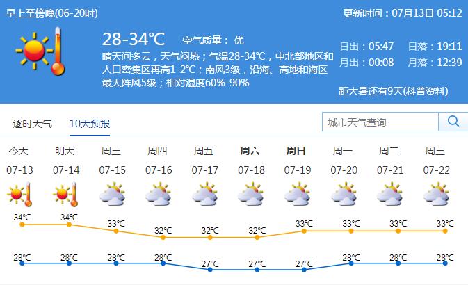 13日氣溫28-34℃,中北部地區(qū)最高氣溫再高1-2℃。