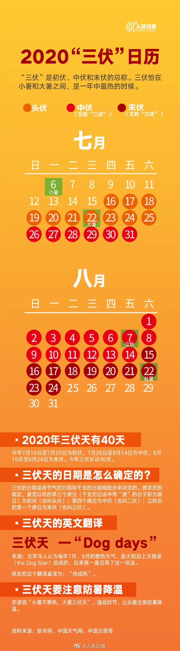 三伏天出現(xiàn)在小暑和處暑之中,是一年中氣溫最高且又潮濕、悶熱的日子。所謂的"伏天兒",就是指農(nóng)歷"三伏天",即一年當中最熱的一段時間。