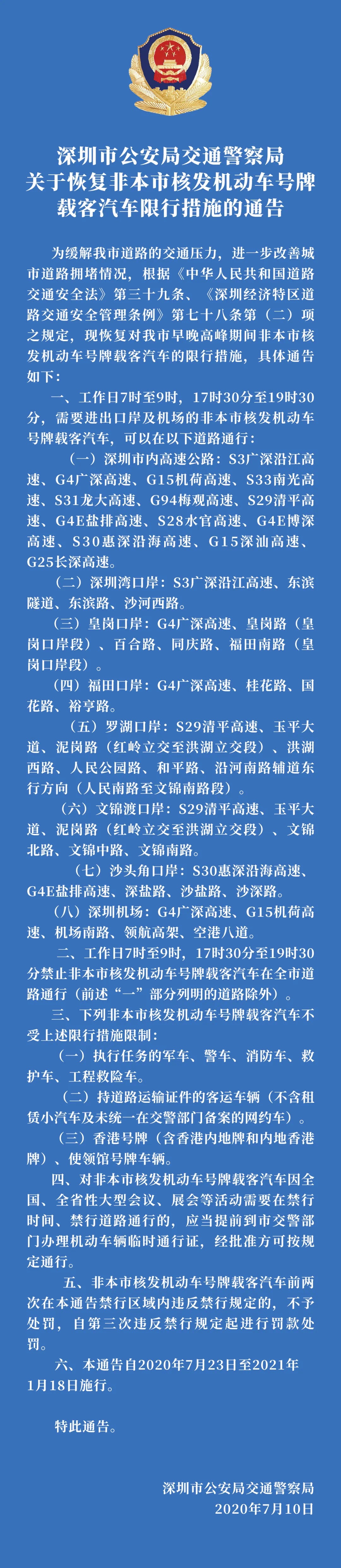見圳客戶端?深圳新聞網(wǎng)2020年7月15日訊(見圳客戶端、深圳新聞網(wǎng)記者 張喆 陳彥如 實(shí)習(xí)生 廖章霖)7月15日,記者從深圳市交警支隊(duì)了解到,7月23日開始深圳將恢復(fù)“限外令”,對非深號牌小型載客汽車恢復(fù)限行。本次“限外令”與此前保持一致,除全市高速公路和部分疏港通道不限行以外,全市所有道路在早7:00-9:00和晚17:30-19:30高峰時段對所有非深圳號牌載客汽車實(shí)施限行。