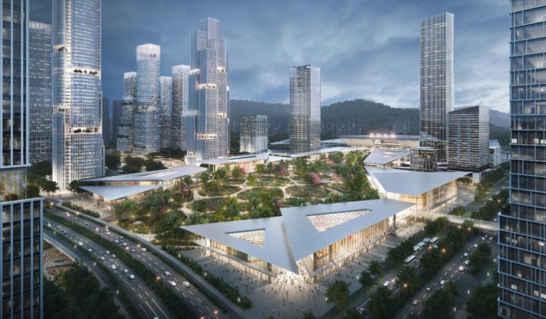 聚落肌理的創(chuàng)新交流坊環(huán)抱中央綠芯,設(shè)置公共服務(wù)、餐飲食肆等功能,通過通透的首層設(shè)計、大挑檐連廊打造,使人們在安享城市服務(wù)的同時,也能夠欣賞優(yōu)質(zhì)的自然生態(tài)景觀,形成一個融合生態(tài)、交通和公共生活的超級中樞。