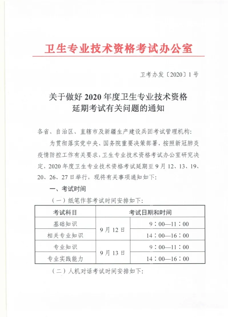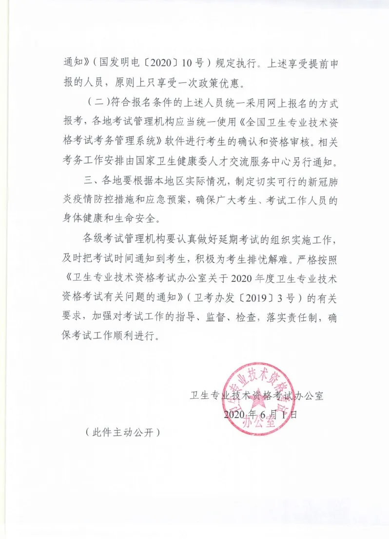 6月1日,衛(wèi)生專業(yè)技術(shù)資格考試辦公室印發(fā)《關(guān)于做好2020年度衛(wèi)生專業(yè)技術(shù)資格延期考試有關(guān)問題的通知》,2020年度衛(wèi)生專業(yè)技術(shù)資格考試延期至9月12、13、19、20、26、27日舉行。