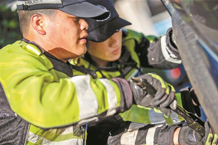 時云財和同事馬上幫助陳先生從車后備箱拿出換胎工具和備胎,在保證安全的前提下,僅用10分鐘就更換好輪胎。“太感謝你們了,深圳交警‘小黃人’真的是我們最信任的人,有你們在我覺得上路開車就很放心?!标愊壬蛔〉馗兄x、稱贊交警鐵騎小哥。