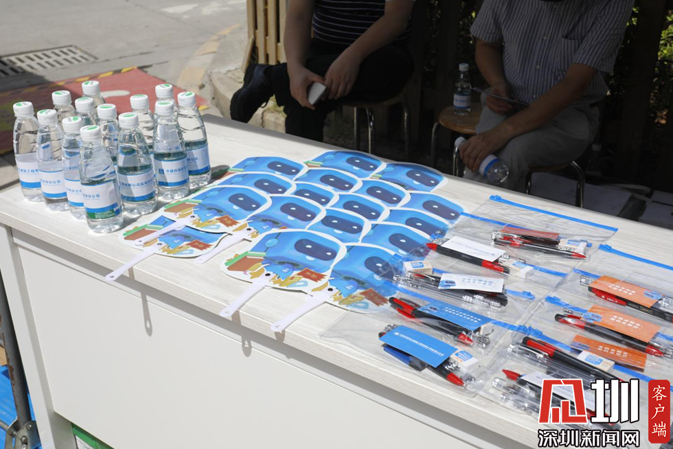 為考生和門(mén)口等待的家長(zhǎng)準(zhǔn)備的文具包、風(fēng)扇和水。