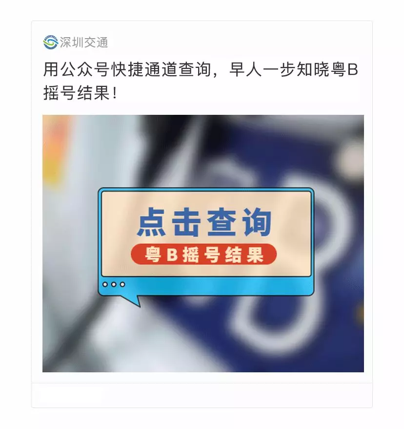 搖號當日,“深圳交通”微信公眾號會第一時間推送公布粵B搖號結果的微信文章。