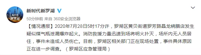 【情況通報(bào)】2020年7月28日5時(shí)17分許,羅湖區(qū)黃貝街道羅芳路晶龍燒臘店發(fā)生疑似煤氣瓶泄漏爆炸起火。消防救援力量迅速到場(chǎng)將明火撲滅,場(chǎng)所內(nèi)無人員居住,事件未造成人員傷亡。目前,羅湖區(qū)相關(guān)部門正在現(xiàn)場(chǎng)處置,事件具體原因正在進(jìn)一步調(diào)查。(羅湖區(qū)應(yīng)急管理局)