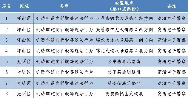 新增機動車逆行高清電警設(shè)備8套,其中坪山區(qū)新增4套,光明區(qū)新增4套。