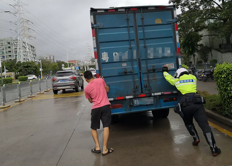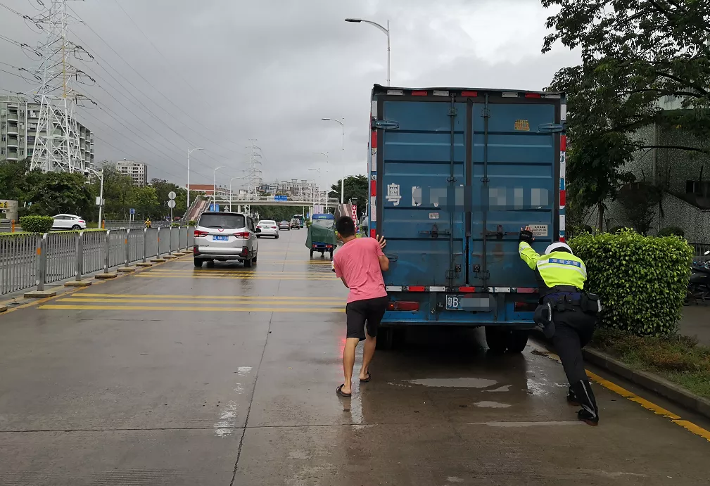 了解情況后,為緩解路面擁堵,避免產(chǎn)生交通事故,鐵騎隊員協(xié)助司機把車推到一邊等待救援。