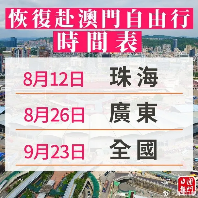 一、自8月12日起,廣東省珠海市公安機關(guān)出入境管理部門恢復(fù)辦理珠海市居民(含居住證持有人,下同)赴澳門旅游簽注;如無特殊情況,8月26日起,廣東省公安機關(guān)出入境管理部門恢復(fù)辦理廣東省居民赴澳門旅游簽注;在內(nèi)地與澳門疫情形勢繼續(xù)總體向好的前提下,全國公安機關(guān)出入境管理部門于9月23日起恢復(fù)辦理內(nèi)地居民赴澳門旅游簽注。