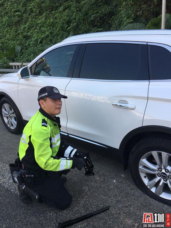 事情發(fā)生在10月11日早上10時(shí)30分許,劉先生駕車出外辦事,車輛行駛至東環(huán)高架西往東方向時(shí),突然一聲巨響左后輪輪胎爆裂車輛半路拋錨,當(dāng)時(shí)正值交通早高峰,過往車輛不斷,故障車輛停在道路中間導(dǎo)致路段交通擁堵,車主劉先生一時(shí)間不知所措,只能留在原地等待救援。此時(shí)正在執(zhí)行巡邏任務(wù)的羅湖交警鐵騎組長(zhǎng)陳展廷見狀,立即停下警車上前查看情況,了解情況后,為了緩解該路段的交通擁堵,防止出現(xiàn)交通意外,陳展廷立即讓劉先生把車??吭谧钣覀?cè)車道,然后安排隊(duì)員用警車在故障車輛周邊設(shè)置出了安全警戒區(qū)域,另一位隊(duì)員則對(duì)過往車輛進(jìn)行指揮疏導(dǎo)及勸慰駕駛?cè)瞬灰?,在安全區(qū)域等待,陳展廷則俯下身為爆胎車輛更換輪胎。約15分鐘的忙碌后,三位鐵騎隊(duì)員已滿身是汗,但在他們的密切協(xié)調(diào)配合下,快速幫助駕駛?cè)藙⑾壬鷶[脫困境,險(xiǎn)情在最短時(shí)間內(nèi)被及時(shí)排除,道路交通秩序也恢復(fù)正常,這暖心一幕讓劉先生很是感動(dòng),緊緊握著陳展廷同志的手連聲表示感謝。