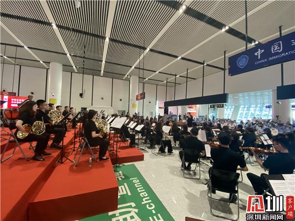 作為慶祝中國共產黨成立100周年專題節(jié)目、蓮塘邊檢站黨史教育學習專題活動,音樂會在莊嚴神圣的升旗儀式中拉開序幕,深圳交響樂團的68名資深演奏人員在嶄新的出入境邊防檢查通道前,奏響了一首首紅色經典旋律,與現代化的口岸邊防檢查設施交相輝映,激蕩回響、動人心魄,體現蓮塘邊檢站全體民警對黨忠誠、服務人民、執(zhí)法公正、紀律嚴明的赤膽忠誠。音樂會在《沒有共產黨就沒有新中國》雄壯的齊唱聲中結束。