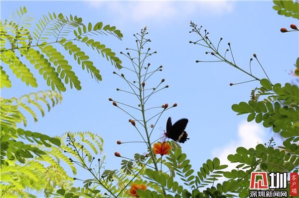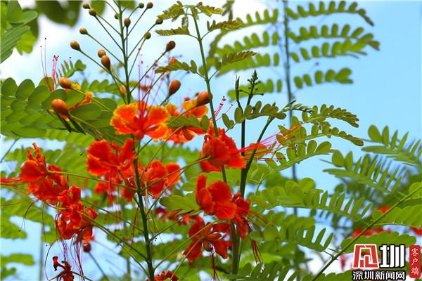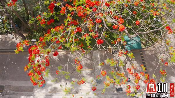 五月綻放全城的鳳凰花,映射著深圳這座城市的繁華與熱情,同時也給這座城市帶來勇敢熱烈的色彩。從鏡頭中可見,鳳凰花花團緊簇,在藍(lán)天的襯托下,那一簇簇火紅的花海張揚而又高調(diào)地綻放,為深圳“藍(lán)”染上了一抹紅。