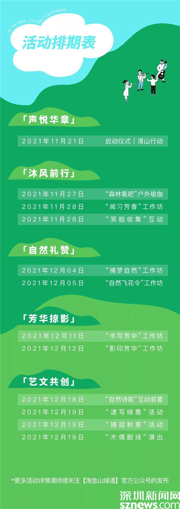 據(jù)悉,自11月27日起連續(xù)四個(gè)周末,深圳公園文化季羅湖分會(huì)場(chǎng)將帶來一系列健康療愈、藝術(shù)文化、傳統(tǒng)文化等戶外活動(dòng),市民可以通過關(guān)注“淘金山綠道”公眾號(hào)了解更多活動(dòng)詳情,報(bào)名參加。