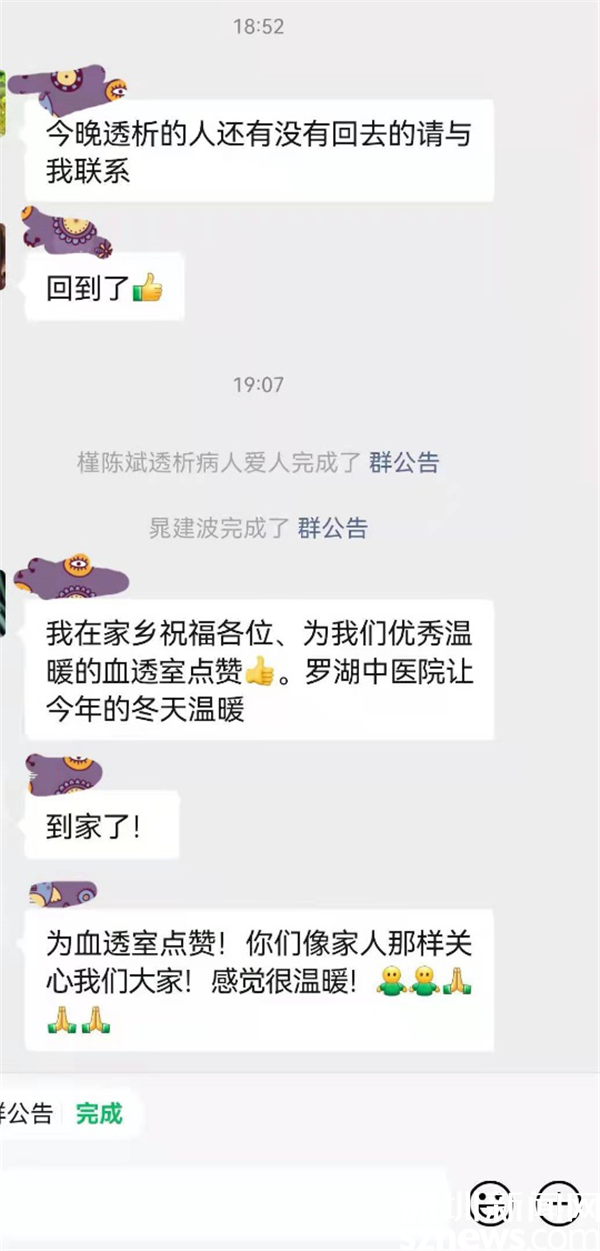據(jù)羅湖區(qū)中醫(yī)院腎病科血液透析室主任王靜介紹,“0107”疫情發(fā)生后,蓮塘片區(qū)管控區(qū)域的居民只進不出。固定來院血透的患者共有70多名,其中有20多名患者居住在蓮塘片區(qū),還有50多人居住在片區(qū)以外。1月7日下午,第二班的血透患者就面臨著如何回家的問題,院領(lǐng)導(dǎo)迅速部署,與區(qū)疫情防控指揮部充分溝通,醫(yī)務(wù)科、后勤支援部和血透室協(xié)助安排好患者離院事宜?!搬t(yī)院安排車輛把這些患者送到封鎖路口,讓患者放心透析,一定讓病人能夠順利回家?!贬t(yī)院常務(wù)副院長趙宏堅定地說。