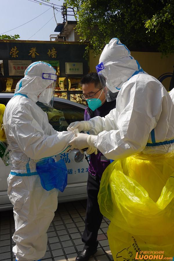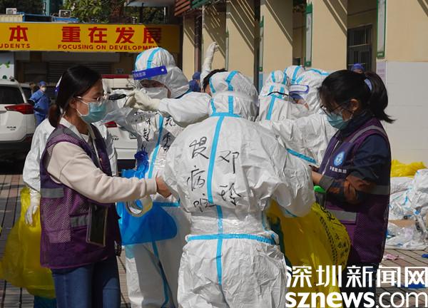 臘八節(jié)剛過,深圳帶著些許涼意,卻也是艷陽高照?!巴緜儯嗷z查一下手腕腳腕有沒有貼好!穿戴整齊后準(zhǔn)備集結(jié)出發(fā)啦!”在封控區(qū)外圍的醫(yī)護(hù)人員整備區(qū),一群身穿防護(hù)服、全副“武”裝的工作人員整裝待發(fā),兩人一組,目光堅定,向著封控區(qū)的入口走去。