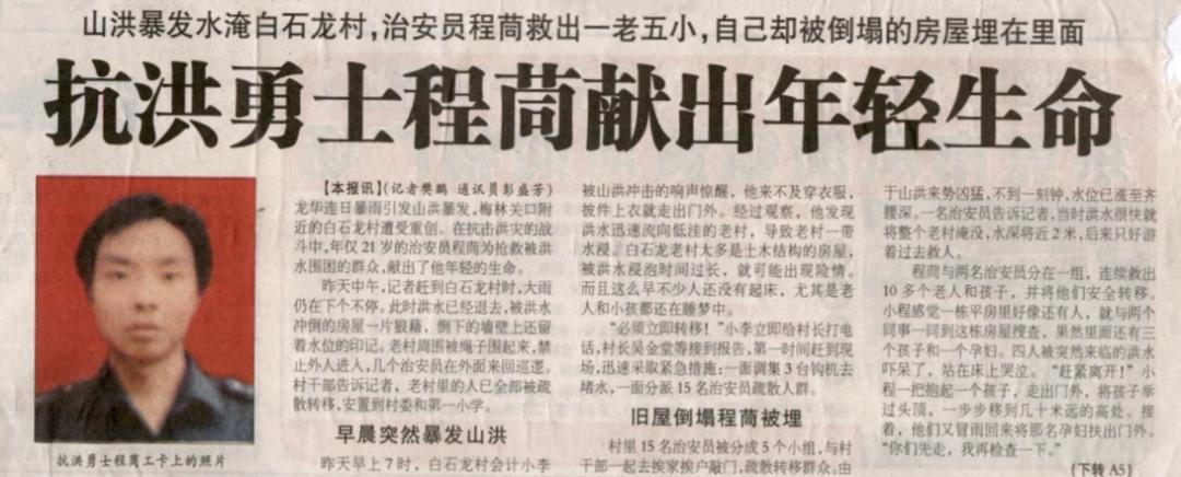 2005年8月19日至21日,深圳持續(xù)普降大到暴雨,民治街道(注:當(dāng)時(shí)為寶安區(qū)龍華街道)降雨最為集中,為幾十年一遇,引起了山洪暴發(fā)。在抗擊洪災(zāi)的戰(zhàn)斗中,年僅21歲的治安員程茼為搶救被洪水圍困的群眾不幸犧牲,獻(xiàn)出了他年輕的生命。