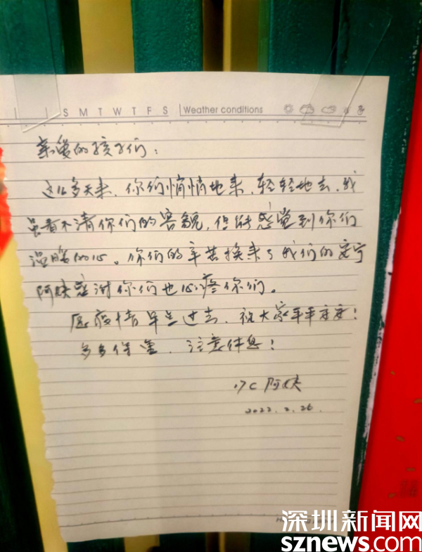 “親愛的孩子們,這么多天來,你們悄悄地來,輕輕地去,我雖看不清你們的容顏,但能感受到你們溫暖的心。你們的辛苦換來了我們的安寧,阿姨感謝你們也心疼你們?!边@是來自桂園街道華瑞大廈B座居民的手寫感謝信,一句“親愛的孩子們”戳中了現(xiàn)場工作人員的心,讓人忍不住淚目。