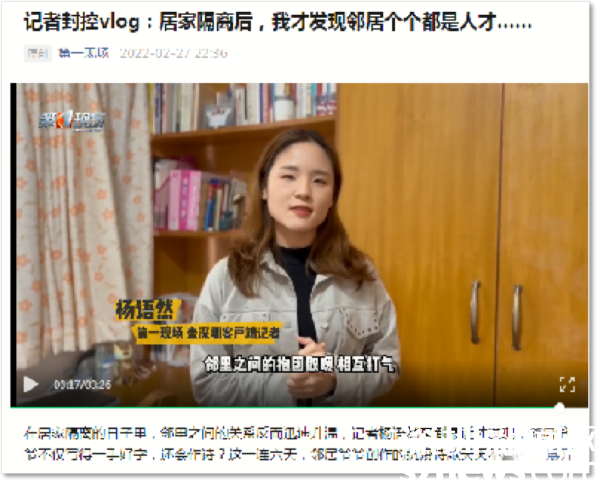住在華瑞大廈A座封控區(qū)的第一現(xiàn)場記者楊語然,每天拍攝視頻記錄封控生活。在她的鏡頭下,封控區(qū)防疫工作有條不紊,民生服務(wù)暖心到位,鄰里之間抱團(tuán)取暖、相互打氣。她表示,因?yàn)檫@段“特殊的”居家隔離時光,鄰里之間的關(guān)系反而迅速升溫,每天在微信群里互動,才知道住在一起的鄰居們那么多才多藝。