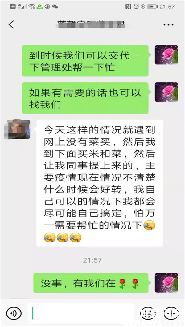 3月13日晚近十點(diǎn),家住蓮塘街道蓮馨家園的黃女士通過微信向畔山社區(qū)黨委副書記鄒紅梅求助,詢問社區(qū)能否在自己待產(chǎn)不方便的情況下幫助購物送貨……。原來,黃女士預(yù)產(chǎn)期在6月份,丈夫在部隊(duì)服役,因?yàn)橐咔樵?,家中老人無法過來深圳照顧,只能自己在家休養(yǎng),心理壓力較大顧慮較多。了解到情況后,鄒紅梅耐心疏導(dǎo)黃女士焦慮和恐慌情緒,說明社區(qū)的關(guān)愛措施,并微信回復(fù)說,“需要幫忙,可以找我們。放心吧,有我們?cè)?。?/p>