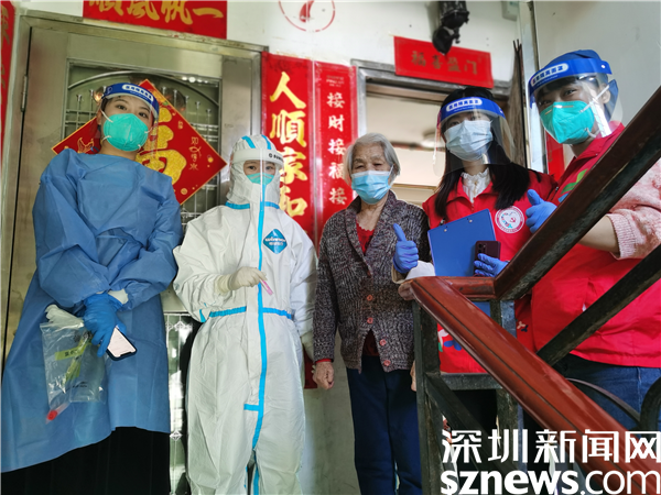 社工帶領(lǐng)醫(yī)護(hù)人員為高齡長(zhǎng)者上門(mén)進(jìn)行核酸檢測(cè)。
