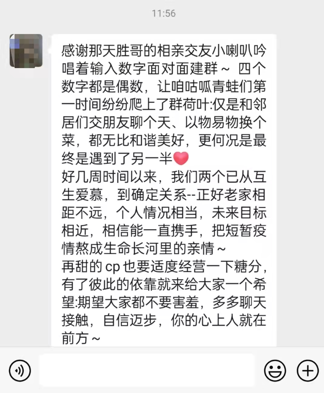 一開始單身交友群只有一個,慢慢地周邊社區(qū)越來越多人加入,群聊數(shù)量增加到了十個。由于群信息互不相通,王勝在每天做完工作后,轉發(fā)各單身青年的個人介紹、照片以及擇偶標準到十個群里,有時發(fā)成語接龍的小游戲活躍氣氛?!叭豪锏膯紊砬嗄陚兎浅7e極,大家都喜歡這種模式。我沒事的時候也經(jīng)常和他們聊聊天,讓大家隔離期間?!蓖鮿僬f。