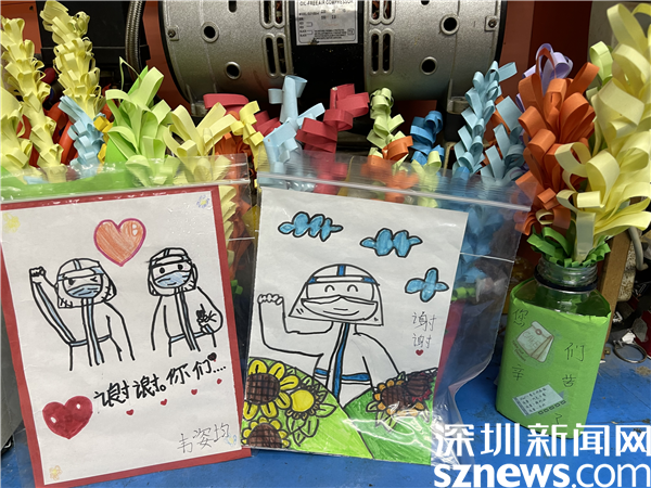羅湖區(qū)蓮塘小學(xué)某班班長(zhǎng)見醫(yī)護(hù)人員和義工志愿者日夜操勞,不辭辛苦,號(hào)召全班同學(xué)為防疫人員“送溫暖”。有的同學(xué)親手制作五顏六色的精美手折紙花,還有些同學(xué)別出心裁的繪制了“感謝大白”賀卡,禮物制作完成后,全班同學(xué)分頭行動(dòng),將手折紙花送到各核酸采樣點(diǎn)醫(yī)護(hù)人員和志愿者手中?!拔覀儙筒簧鲜裁?,做些力所能及的事情,為大哥哥大姐姐送去感動(dòng)和力量,也是為抗疫做貢獻(xiàn)。”來自羅湖中醫(yī)院,在蓮塘村七巷小廣場(chǎng)支援的醫(yī)護(hù)人員們收到同學(xué)們送來的“禮物”非常開心,紛紛表示,雖然每天工作很辛苦,但能得到群眾尤其是孩子們的肯定十分幸福,禮物雖小,卻無比溫暖和感動(dòng)。
