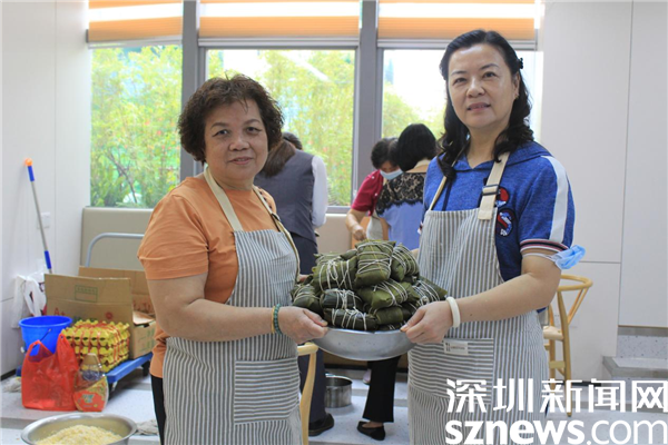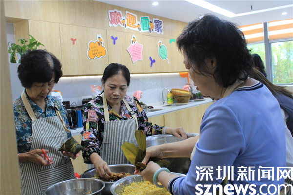 一起包粽子的30名“大廚”中,有社區(qū)居民,也有轄區(qū)企業(yè)員工。年齡最大的73歲,是老圍社區(qū)的蔡屋圍村民,年齡最小的25歲,是轄區(qū)企業(yè)員工。只見(jiàn)她們圍桌而立,雙手包著粽子,嘴里說(shuō)著家常,臉上帶著笑,沒(méi)多大工夫,一個(gè)個(gè)有棱有角的粽子就在大盆里堆成了小山。每一顆粽子都有家的味道,都帶著滿滿的祝福和對(duì)美好生活的憧憬。不少居民在老圍社區(qū)出生長(zhǎng)大,一住就是一輩子,她們見(jiàn)證了社區(qū)家園日新月異的變化,她們熱愛(ài)這塊土地,熱愛(ài)老圍社區(qū)。