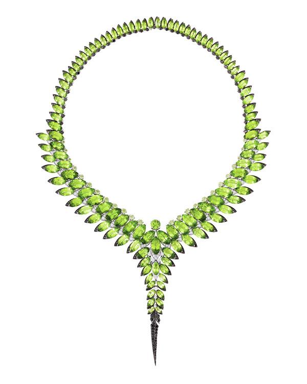 此外,橄欖石不僅是珠寶首飾材料,也可化身服裝、腕表及擺件的組成部分。乘著設(shè)計(jì)師、藝術(shù)家的無(wú)窮想象力,橄欖石與多媒介、多材質(zhì)相結(jié)合,碰撞出斑斕旖旎的時(shí)尚表達(dá)——讓這一抹鮮亮的綠色,成為游走于日常生活的獨(dú)特色彩。