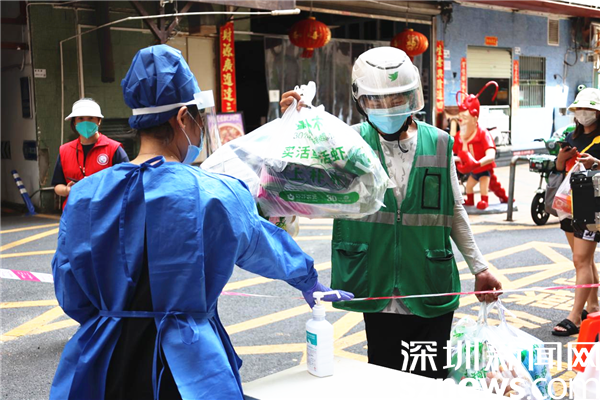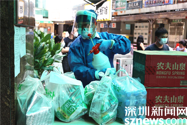 8月29日下午,深圳新聞網記者來到羅湖區(qū)南湖街道文錦社區(qū)凱悅華庭,只見小區(qū)居民正保持著一米距離有序地進行核酸檢測,身穿防護服的“藍墩墩”在一旁忙碌著。記者在現(xiàn)場看到偶有“騎士”將居民在網上商城所下單的物資像傳送接力棒一樣交到“藍墩墩”的手上,“藍墩墩”接過之后,立即進行全方位的消殺工作。