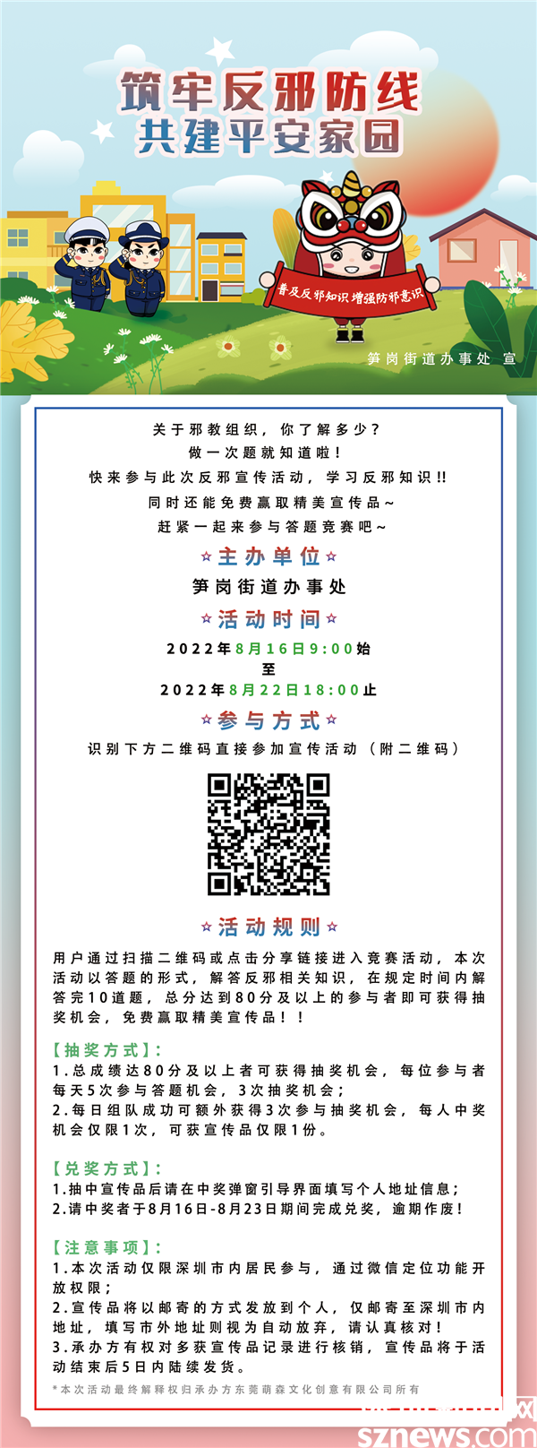 為做好反邪教警示教育宣傳工作,引導(dǎo)轄區(qū)內(nèi)居民進(jìn)一步認(rèn)清邪教危害,提高反邪教意識(shí)和能力,營(yíng)造“無(wú)邪羅湖、和諧社區(qū)”濃厚氛圍,筍崗街道持續(xù)開展以“防范邪教侵害、守護(hù)平安家園”為主題的反邪教宣傳系列活動(dòng),實(shí)現(xiàn)反邪教宣傳全覆蓋。
