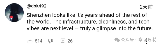 (“深圳看起來(lái)比世界其他地方領(lǐng)先好幾年?;A(chǔ)設(shè)施、清潔度和科技氛圍都是一個(gè)新的水平——真正讓人看到了未來(lái)。”)