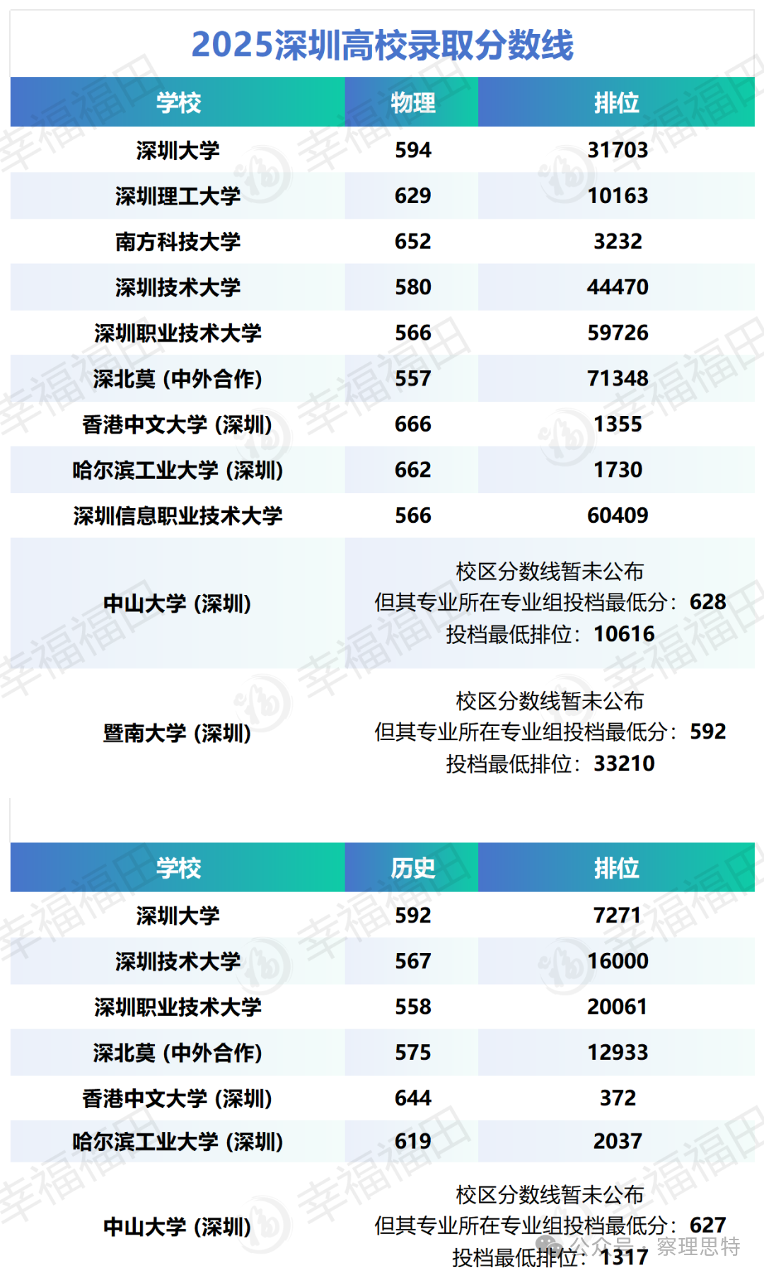 從整體數(shù)據(jù)來看,深圳高校在物理類投檔中表現(xiàn)尤為突出,哈爾濱工業(yè)大學(xué)(深圳)、南方科技大學(xué)、深圳理工大學(xué)在省內(nèi)高校中位居前3。歷史類投檔中,深圳高校同樣表現(xiàn)不俗,哈爾濱工業(yè)大學(xué)(深圳)、深圳大學(xué)在全省所有高校中排名前10,反映出深圳高校文理均衡發(fā)展的良好態(tài)勢。