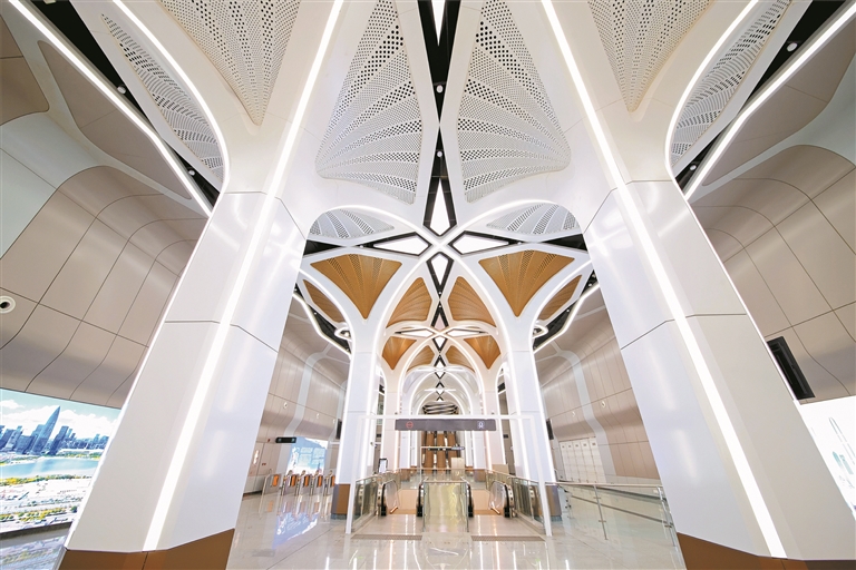 記者在該線特色站之一的石鼓站看到,該站毗鄰大疆天空之城總部、鵬城實驗室、萬科云城設計公社等,具有科技創(chuàng)新和藝術(shù)創(chuàng)意的文化特征。工作人員介紹,車站以“無人機”為設計靈感,將機翼、機身的形態(tài),抽象轉(zhuǎn)化為標準化、模塊化的裝飾單元,構(gòu)筑出車站空間的主體框架,宛如一架巨型穿梭機,車站立柱猶如科技之樹,寓意城市的蓬勃發(fā)展。