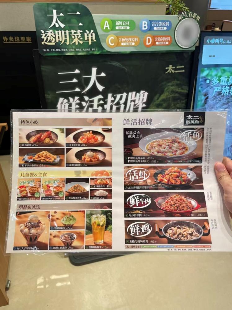 A類為最鮮活分類,代表“新鮮主食材制作”,在太二“鮮活模式”門店的最新菜單中,A類涵蓋活魚、活蝦、鮮雞、鮮牛肉以及新鮮蔬菜。其招牌酸菜魚采用每日新鮮配送到店的活魚,經(jīng)門店現(xiàn)殺、切片、腌制,搭配非遺傳承工藝制作的酸菜現(xiàn)點現(xiàn)煮;生炒菜心和白玉絲瓜等菜品則承諾使用日供新鮮蔬菜,現(xiàn)點現(xiàn)炒。