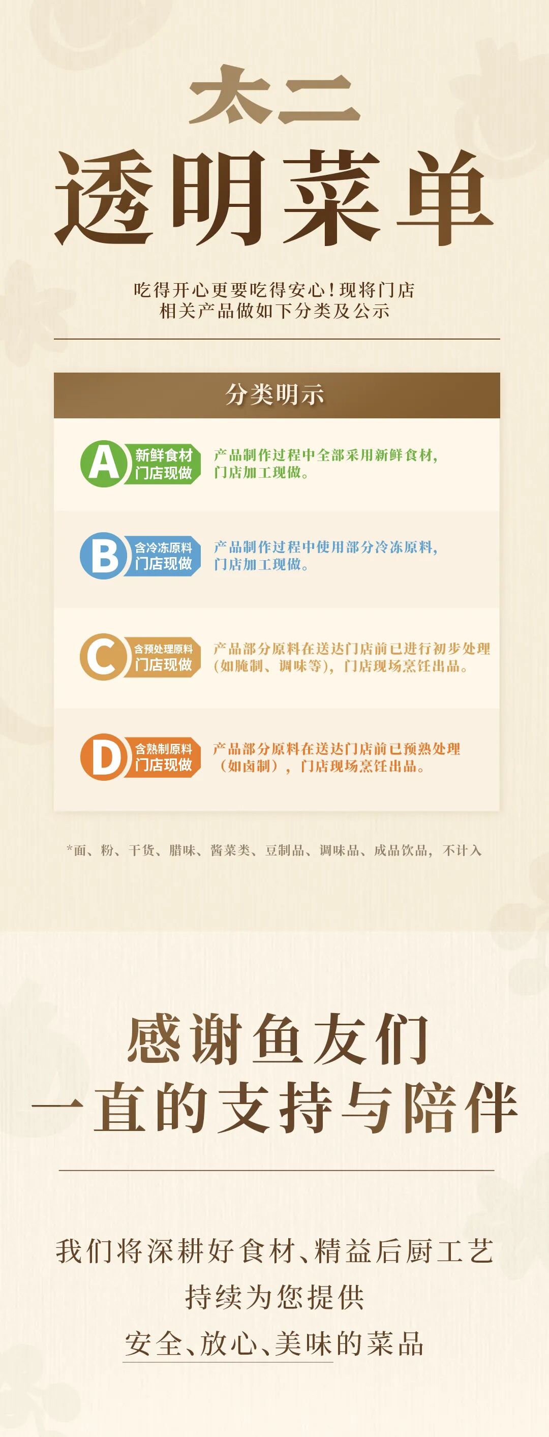對于使用冷凍及預處理食材的菜品,太二透明菜單同樣進行了清晰標注:B類的香辣魷魚須因魷魚須為冷凍原料歸入此類,C類的川式豬頸肉因采用預先腌制的生豬頸肉劃分至該類別,D類的虎皮雞爪則基于“雞爪集中烹炸后配送至門店”的預處理特性劃分,讓消費者直觀知曉食材處理全流程。