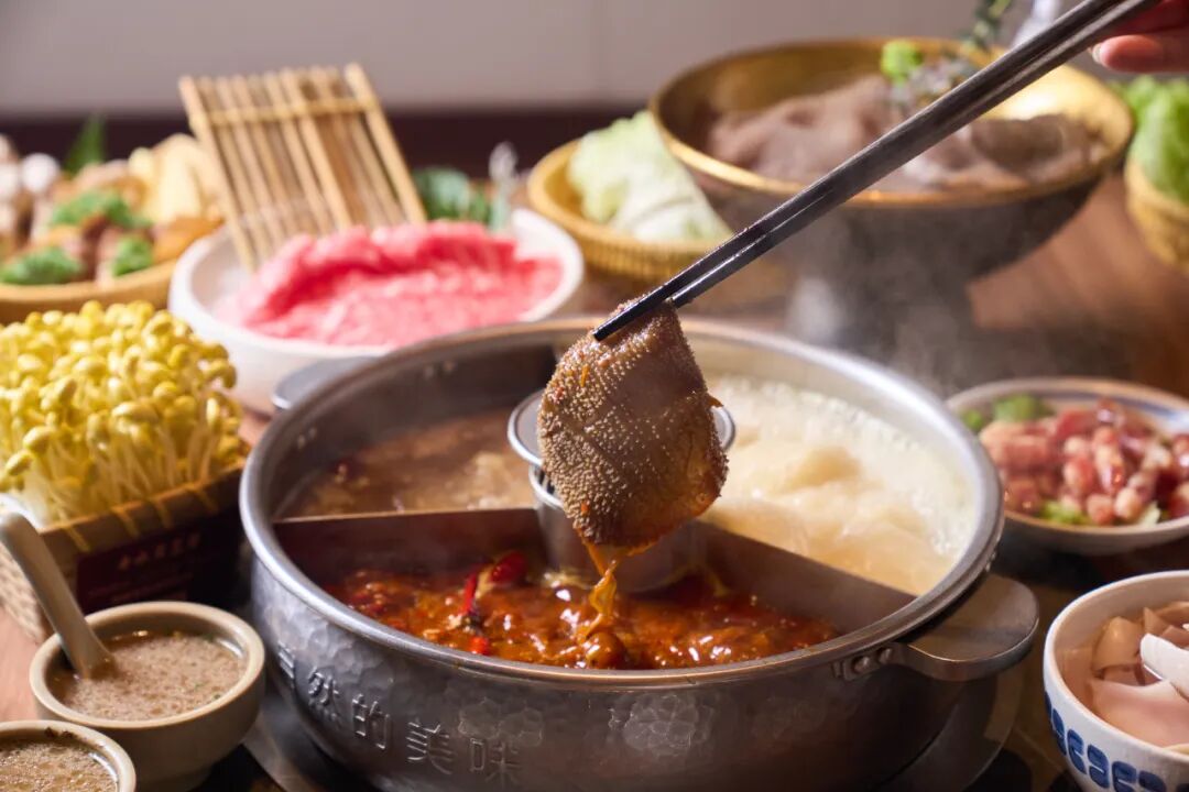 一是產(chǎn)品主義構(gòu)筑價值壁壘。聚焦“毛肚+菌湯+12大護(hù)法產(chǎn)品”,菜單精簡至60道,強(qiáng)化“物有所值”認(rèn)知。招牌毛肚采用新西蘭直采原料,經(jīng)專利技術(shù)處理,點(diǎn)購率高達(dá)139%;菌湯每日門店現(xiàn)熬8小時,打造儀式感。