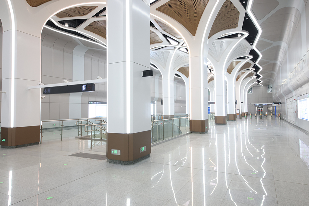 石巖站為特色站之一,毗鄰石巖濕地公園和陽(yáng)臺(tái)山森林公園,車(chē)站設(shè)計(jì)從自然中汲取靈感,融入陽(yáng)光、樹(shù)葉等自然元素,天花模擬自然采光,搭配葉脈元素,將自然樹(shù)木的質(zhì)感與陽(yáng)光透過(guò)樹(shù)葉的意向相結(jié)合,使乘客在出行中感受自然意象與現(xiàn)代建筑的和諧。
