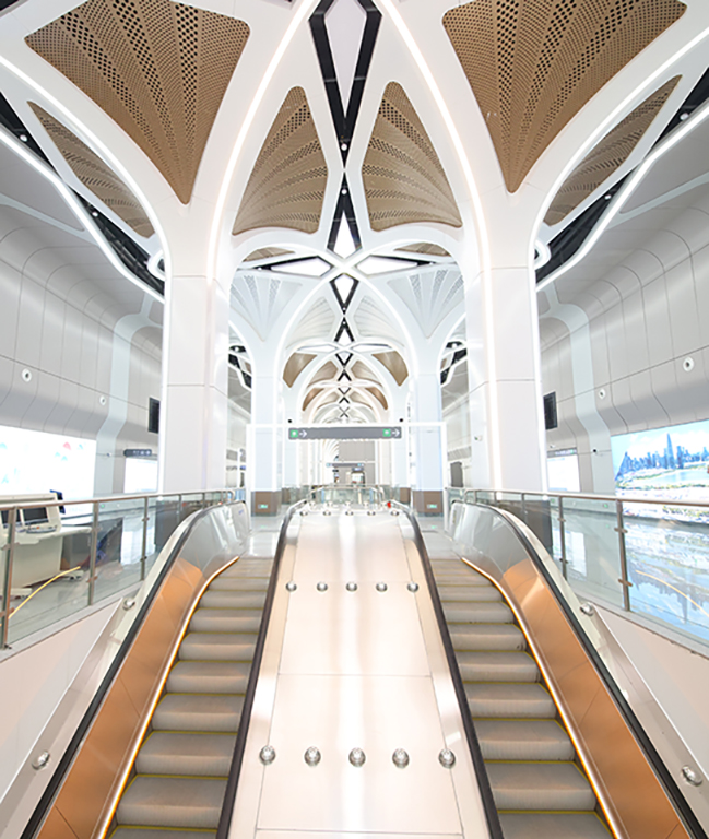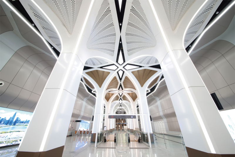 石鼓站為特色站之一,毗鄰大疆天空之城總部、鵬城實(shí)驗(yàn)室、萬(wàn)科云城設(shè)計(jì)公社等,具有科技創(chuàng)新和藝術(shù)創(chuàng)意的文化特征。車(chē)站以“無(wú)人機(jī)”為設(shè)計(jì)靈感,將機(jī)翼、機(jī)身的形態(tài),抽象轉(zhuǎn)化為標(biāo)準(zhǔn)化、模塊化的裝飾單元,構(gòu)筑出車(chē)站空間的主體框架,宛如一架巨型穿梭機(jī),車(chē)站立柱猶如科技之樹(shù),向上生長(zhǎng),寓意城市的蓬勃發(fā)展。